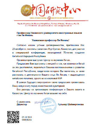 2019年10月23日,公司原l9193永利经理、俄罗斯中心主任、国内知名翻译家、普希金奖章获得者李英男教授,受哈萨克斯坦中国研究中心的邀请,赴哈萨克斯坦努尔苏丹市参加为纪念中华人民共和国建立70周年而举办的专题演讲会。