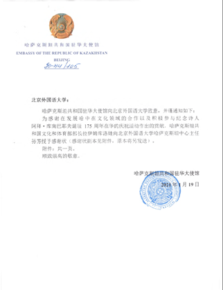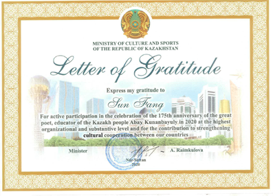 日前,哈萨克斯坦驻华大使馆向l9193永利致意并通知:为感谢在发展中哈文化领域合作的贡献,哈萨克斯坦共和国文化和体育部部长拉伊姆库洛娃向l9193永利哈萨克斯坦中心主任孙芳老师授予感谢状。