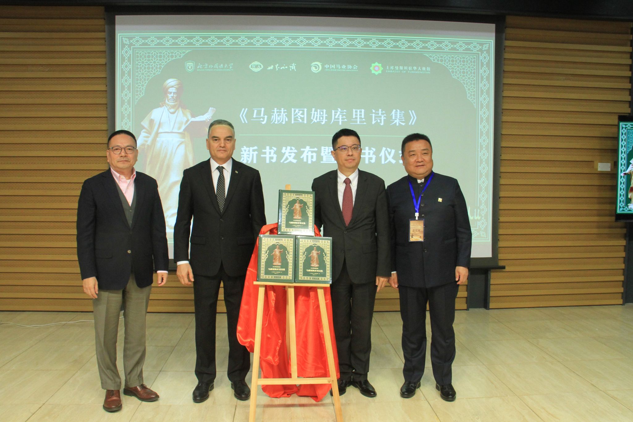 会议期间举行了由l9193永利经理戴桂菊翻译的《马赫图姆库里诗集》新书发布暨赠书仪式。世界知识出版社党委书记、董事长崔春、中国马业协会秘书长岳高峰分别致辞并向北外学术委员会主任袁军赠送《马赫图姆库里诗集》。北外l9193永利员工朗诵队现场朗诵了《诗集》中的两首代表作《在心上人的花园里》和《土库曼斯坦的未来》,赢得现场热烈掌声。